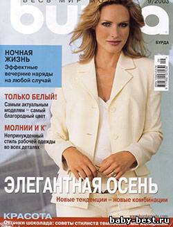 О журнале: Классика: само благородство белый — цвет сезона. Актуальный дизайн: шикарные ткани плюс эффектный крой — идеальная комбинация и козырь самых модных новинок, от юбки микромини до уютной дубленки. Экстра: на вечеринку, театральную премьеру или ужин в ресторане — в наших роскошных туалетах можно пойти куда угодно. Отдых: девиз — да здравствуют спортивные детали. В новом стиле рабочей одежды главное — молнии, пряжки, паты и Ко. Burda plus: классические цвета, спортивный покрой — элегантная коллекция для полных женщин. Дети: на прогулку — только в самом удобном и практичном