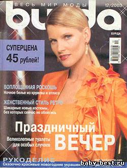О журнале: Классика: великолепные вечерние туалеты в великолепных сияющих красках — с пайетками и бисером, в тафте и шелке вы будете восхитительны. Актуальный дизайн: ночное белье класса люкс из атласа и кружева — роскошь, которую вы можете себе позволить. Тенденции: сама элегантность — женственные юбки, маленькие жакетики и благородные топы для истинных леди. Экстра: мода для кукол. Отдых: все из флиса — комфортная домашняя одежда с подходящими аксессуарами. Burda plus: эффектные выходные наряды для полных женщин. Дети: очаровательные праздничные комплекты для маленьких модниц