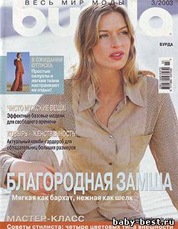 О журнале: Классика: легкий лен — один из главных фаворитов лета. Эффектные модели в актуальном непринужденном стиле. Отдых: простые модели в теплых летних красках настраивают на отпускной лад. Актуальный дизайн: кулиски, шнуровки, накладные карманы — в городском стиле тон задают спортивные детали. Экстра: чисто мужские вещи в чисто белом цвете. Тенденции: благородная замша — материал, в который невозможно не влюбиться. Мини-коллекция элегантных мужских и женских моделей. Дети: спортивный крой плюс яркие краски — сочетание, обреченное на успех. Burda plus: весенний гардероб в сине-белой гамме для полных женщин