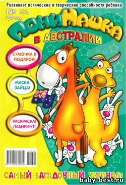 О журнале: Красочный журнал для детей младшего школьного возраста с раскрасками, кроссвордами, загадками, ребусами и лабиринтами. Тема номера: пони Машка в Австралии. Поделки номера: маска кролика и сумочка из бумаги.