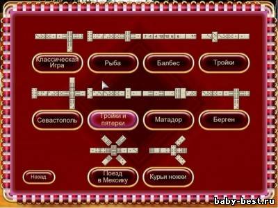 Домино — игра для всей семьи и любых возрастов. Наверняка и в вашем дворе не раз звучал радостный возглас: «Рыба!», и очередной везунчик выигрывал партию. Больше вам не придется долго искать соперников, чтобы насладиться любимой забавой. Просто включите компьютер и сразу же приступите к игре — вы ведь уже знакомы с правилами? Попробуйте себя в новых вариантах домино — таких, например, как «Мексиканский Поезд». Старые добрые игры никогда не забываются — они просто обретают новый облик!