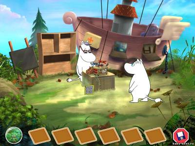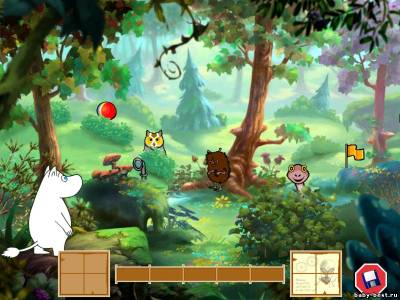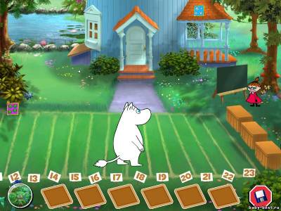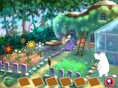 В далекой сказочной стране под ласковым солнцем лежит прекрасная долина. Там обитают славные существа, похожие на белых бегемотиков, – доброе и мудрое семейство Муми-троллей. У них есть соседи – мюмлы, хемули, снорки, сниффы и еще множество забавных созданий. Все они отлично ладят и дружат домами. Но однажды покой Муми-дола был нарушен… Что это за странный звук?! Как будто за морем завыл кто-то огромный. Вой эхом раскатывался по всей долине и был настолько громок и ужасен, что никто не мог уснуть. Отправиться и разузнать, что случилось, решил отважный Муми-тролль. Он собрался было лететь за море на воздушном корабле Снорка, но вот незадача: у корабля не хватает деталей – их разбросало недавним ураганом. Собирая по долине части корабля, Муми-тролль выиграет у Крошки Мю турнир по морскому бою, поможет Хемулю вырастить садик, разгадает каверзные загадки Вонючки и даже побывает в пещере с привидениями! И это далеко не все! Муми-тролль не был бы Муми-троллем – находчивым, ловким и смышленым – если бы не довел дело до конца. И как же он удивится, когда наконец найдет причину загадочного эха! Неважно, сколько вам лет: игра по мотивам сказок финской писательницы Туве Янссон, очарует и малышей, и взрослых. Приготовьтесь не только напрячь память и внимание (на самом сложном уровне придется нелегко не только ребятишкам!), но и улыбнуться – теплый скандинавский юмор понравится всем без исключения! Игра предназначена для детей от 4 лет.