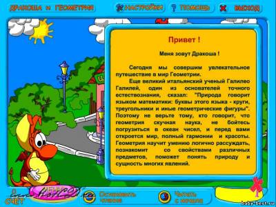Дракоша и занимательная геометрия входит в серию обучающих игровых приложений, которые будут интересны и детям и взрослым любого возраста. Вы совершите увлекательное путешествие в мир геометрии, погрузившись в океан чисел и открыв мир, полный гармонии и красоты. Обаятельный гид Дракоша, сопровождает вас на протяжении всей игры. Опираясь на геометрию, он научит умению логично рассуждать, познакомит со свойствами различных предметов и поможет понять природу и сущность многих явлений. В каждом разделе есть игры, носящие познавательный характер, а за успешное прохождениевам начисляются очки.