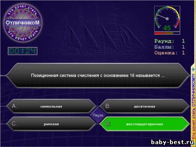 Кто хочет стать ОТЛИЧНИКОМ?! — система предназначена для проверки знаний учащихся средних школ в игровой форме. Также будет полезно ее использование при подготовке к контрольным работам, изучении и повторении тех или иных тем и просто в качестве логической интеллектуальной игры.