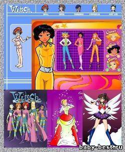Девочки смогут нарядить супершпионок Totally Spies и чародеек W.I.T.C.H., выполнить их миссии, собрать пазлы, а также потанцевать или пострелять с Тоталли спайс. Найдутся наряды и для других героев: Сейлор Мун, Наруто, Красной шапочки, Бэлль, Спящей красавицы и др.