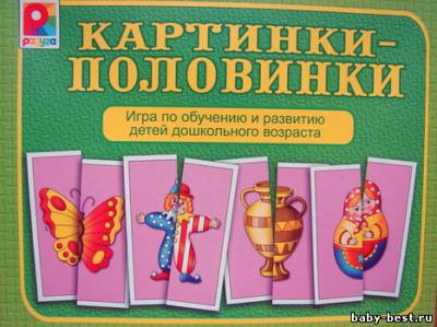 Предложите детям собрать картинки из половинок, найти похожие картинки и сравнить их между собой. Можно проводить игру в форме соревнования, кто больше успеет собрать карточек.