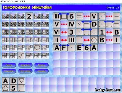Einstein — это логическая головоломка написанная по мотивам старой досовской игры Sherlock, которая в свою очередь была написана по мотивам задачи Эйнштейна. Эйнштейн утверждал что только 2% людей обладают интеллектом достаточным для ее решения. Цель игры — узнать расположение всех фишек, пользуясь подсказками и логикой.
