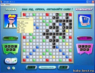 Эрудит PC v1.4 — Для любителей интеллектуального отдыха предлагаем электронную версию игры Эрудит. Вам не придется на бумажке считать очки, залезать под стол за упавшей буквой. Вы сможете поиграть с приятелем или оттачивать свое мастерство, играя с компьютером — он \»знает\» более 51000 слов (и словарь толкований для 43500 слов)! (Для игры с приятелем можно подключить вторую мышку.) Для начинающих игроков есть подсказка, но очков за слова будут давать меньше.