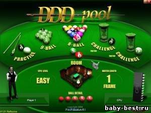 DDD Pool – это игра в бильярд, в которой современнейшая трехмерная графика, реалистичная физика и плавный процесс игры гарантируют вам долгие часы приятного времяпровождения. Попрактикуйтесь в режиме обучения, затем сыграйте в восьми — или девятишаровый пул против своих друзей или компьютерного игрока – или сыграйте на время в любом из двух усложненных режимов и попадите в таблицу лучших. Вы можете выбрать одну из трех детально прорисованных комнат для игры.