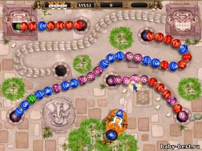 Игра «Бенгал» по своей сути является гибридом таких знаменитых игр, как Зума и Люксор. Ваш герой будет тигр, управляя им вам необходимо бросать шарики разных цветов по подвижной цепочки, состоящей из таких же шариков. Ваша задача – составить цепочки с тремя или более одноцветными шариками, после чего они исчезают. Цепочка будет двигаться по направлению пасти Каменной обезьяны, и когда она ее достигнет вам придется начинать уровень заново, не допускайте этого. Одной из особенностей, выделяющей данную игру , является то, что есть уровни, где траектория шариков изменяется.