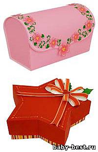 Вам понадобится лишь тюбик клея, ножницы или острый нож, чтобы превратить листы с выкройками в красивые коробочки для подарков.