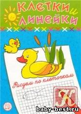 На каждой странице представлен рисунок для раскрашивания, всевозможные задания на продолжение элементов, дорисовку, обводку, продолжение закономерности и т.д. Есть простые рисунки (кружочки, волны, овалы, листики и т.д.), а есть и достаточно сложные (мышки, утята,пальмы,колокольчики, бабочки и т.д.). Есть задания на рисование по контуру клетки, а есть на рисование плавными линиями. Клетки и линейки / утка. Рисуем по клеточкам