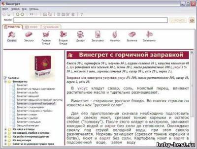 Это прикольная ЦИФРОВАЯ КУЛИНАРНАЯ КНИГА, предназначенная для гурманов, молодых хозяек, а так же всех, кто пожелает приготовить для себя (и не только), чего-нибудь вкусненького. Программа содержит более 3300 рецептов и описания приготовления блюд из любых продуктов. Рецепты по душе найдут здесь для себя любители сладкого и любители остренького, любители плотно и сытно поесть, а так же сторонники вегетарианства. Любители самодельных вин и настоек с удовольствием обнаружат массу рецептов, для пополнения своей коллекции. В ней содержится много подробных рецептов для любителей консервации. А справочник по специям и пряностям не будет лишним для любой хозяйки, желающей грамотно относиться к этим весьма полезным, но капризным ингредиентам. В версии 2.5 появилась возможность добавлять свои рецепты, а также разработан механизм расширения базы рецептов посредстом загрузки и инсталляции дополнительных модулей со статьями (расширений). ПОЛНАЯ версия, со всеми дополнениями баз данных рецептов выпущенными на настоящий момент! «ВИНЕГРЕT» — ЭТО: солидная база рецептов из разных источников, возможность добавлять собственные рецепты, удобный механизм расширения базы, единый стиль статей и рецептов, проработанная классификация, перекрестные ссылки, удобный интерфейс, расширенный поиск, закладки.
