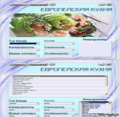 Программа «Кулинарный рай» основана на мощной поисковой системе. В вашем распоряжении около 1000 рецептов блюд европейской кухни. Особое внимание уделено французской, средиземноморской и итальянской кухне. Пользоваться программой очень просто: ваша задача выбрать продукты, из которых вы хотите приготовить блюдо и его тип (салат, второе блюдо и т.д.) и программа сама выдаст вам список рецептов. Выбирайте любой и готовьте в свое удовольствие. Приятного аппетита!