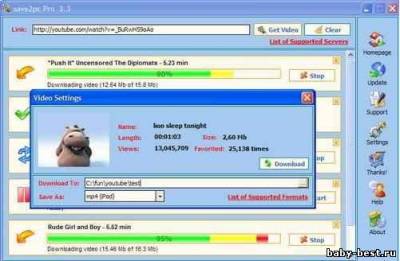 Save2pc Pro — крайне простая в использовании утилита, которая позволяет сохранять видео с известного файлового хранилища YouTube и Google Video. Просто вставьте ссылку на нужный файл в окошке программы, укажите папку для сохранения видео, а все остальное save2pc сделает сама, вы же в результате получите интересующий вас .avi, .mpeg, .flvG файл или файл в мобильном формате mov, mp4, 3gp, mp3, wav.