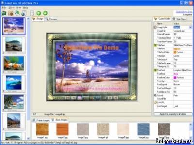 Longtion SlideShow Pro — программа, которая поможет вам в создании слайд шоу из ваших фоток и не только это. Она может также создает слайд шоу в Flash Movie Format, также в EXE и HTML файлы.