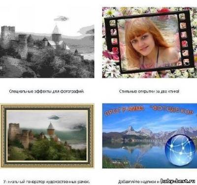 Описание: ФотоДЕКОР — это новая программа для оформления фотографий и создания эффектов. Буквально за пару секунд Вы сможете наложить стильную рамку, создать поздравительную открытку или коллаж. Программа включает все необходимые функции для обработки цифровых фотографий: автоматическое улучшение и редактирование, создание спецэффектов, обрамление, добавление украшений и надписей. Комплект программы включает около трёхсот различных вариантов оформления, а в полной версии их число увеличивается до тысячи!