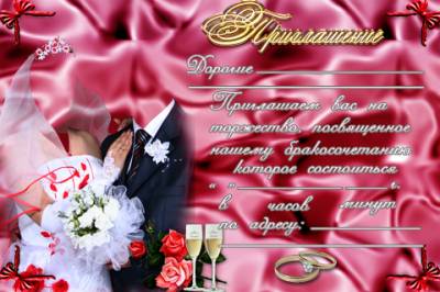 ПрограммыВсе для фотошопа Шаблон «Приглашение на свадьбу» 23.06.2009 Шаблон «Приглашение на свадьбу», формат PSD(1772*1181), все на отдельных слоях, слои отключены Размер архива 5,33Мб Depositfiles Letitbit Turbobit.. Читать также: Рамка для фото "Белые розы"